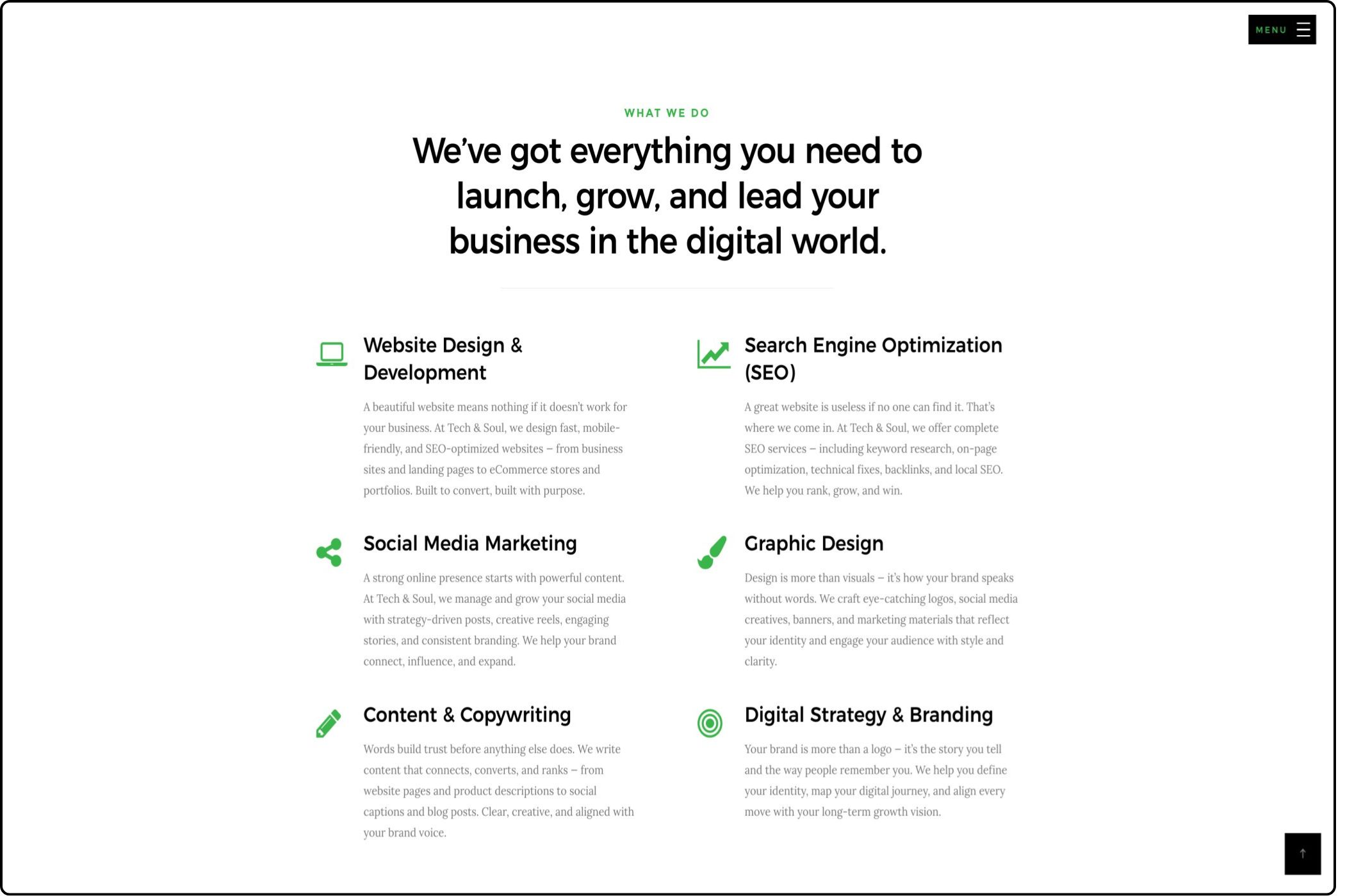 At Tech & Soul, we don’t just create websites — we build digital identities that speak, sell, and scale. From strategy to execution, we bring energy, clarity, and complete dedication to every project.